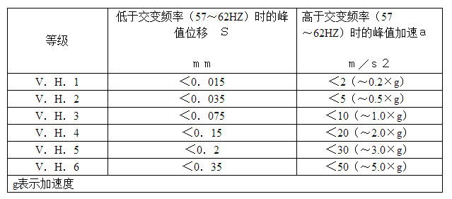 高頻振動(dòng)等級通常是:在交變頻率(57~62HZ)以下用恒定峰值位移線表示振動(dòng)等級;在交變頻率(57~62HZ)以上用恒定峰值加速線表示振動(dòng)等級。