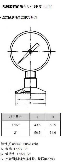 Y-M系列衛生型隔膜壓力表具有裝拆快捷方便,易于清洗,不易污染,清潔美觀,安全可靠等優點。并滿足藥品生產質量規范的要求,可廣泛應用于制藥﹑食品﹑飲料﹑制酪﹑水處理等行業。 ○主要技術指標 隔膜表的耐蝕性 隔膜表的耐蝕性可通過合適的選擇與測量介質接觸部分的隔膜﹑法蘭及密封圈的材料來保證。 隔膜材料:316﹑316L 法蘭材料:316﹑316L 密封圈材料:硅橡膠﹑聚四氟乙烯 密封液的選擇: 為了保證衛生型隔膜表使用的可靠性和安全性,根據不同用途,選擇合適的密封液。 ○測量范圍及型號標示