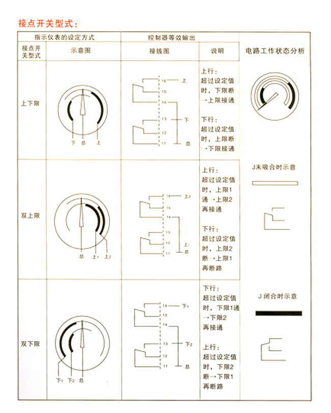 Instruments of anti-media and the impact of fluctuating load, vibration-resistant environment, such as outstanding characteristics. Button-meter located on the lower limit of two switch contact device, the pressure to set a signal or when the value of on-off control circuit for the operating system's automatic control or the use. General Instrument, contact only applies to copper and copper alloy no corrosive effect of the liquid, gas, media measurement. Button-type contact instruments, also has an outstanding advantage of high temperature acid, is particularly applicable to non-filled liquid, high-voltage (380 VAC, 220VDC) for the user to switch control signals, based on the original contact the head of the increase contacts , The switch to signal more reliable, more stable work, in the case of high-voltage more extended service life, the wider use of machinery, petroleum chemical industry, metallurgy, electric power and other industrial processes. |